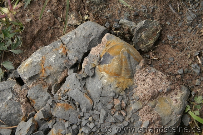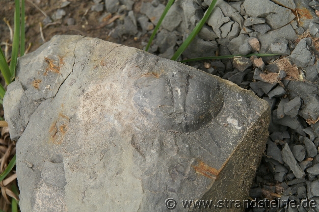 grauer, mergeliger bis splittriger Kalk, leicht verwitternd und dann