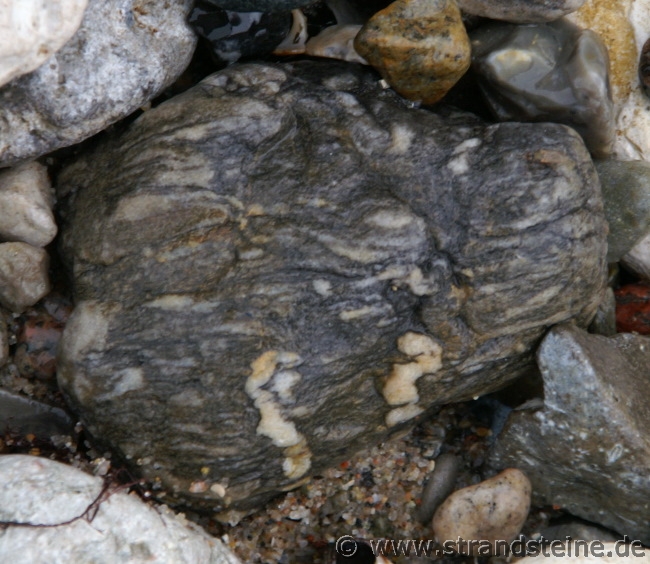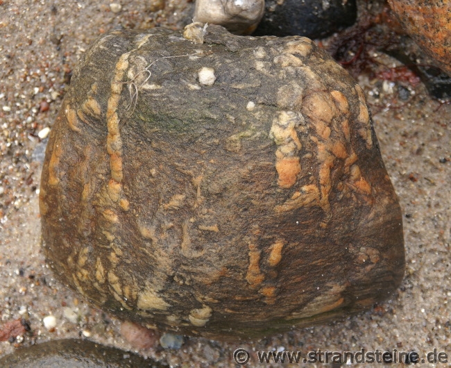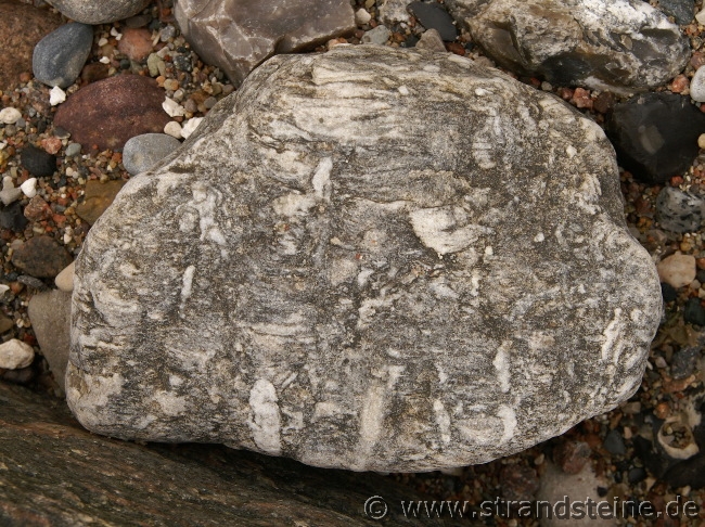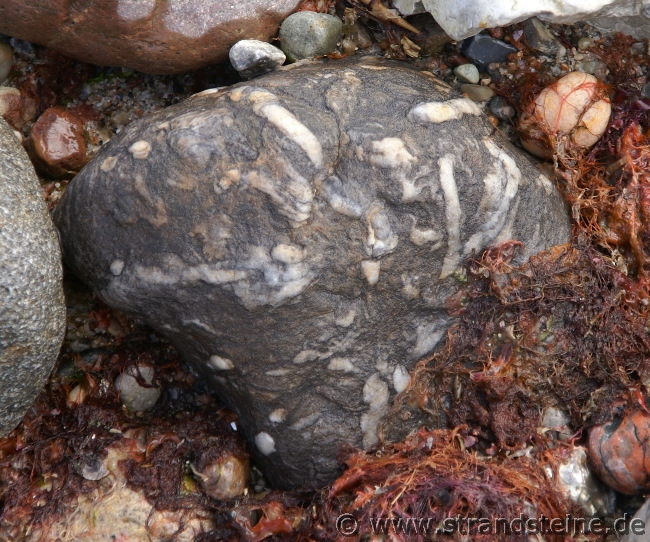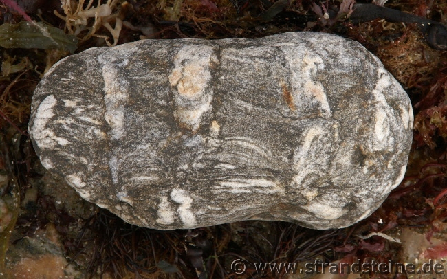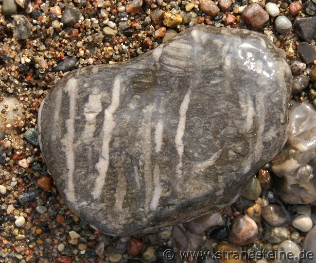 Kennzeichen: heller, quarzitischer Sandstein mit zahlreichen, dicht liegenden, dunklen Lagen. Stark bioturbat, mit unregelmäßigen senkrecht verlaufenden Bohrgängen und horizontalen
