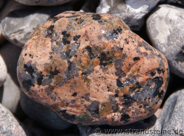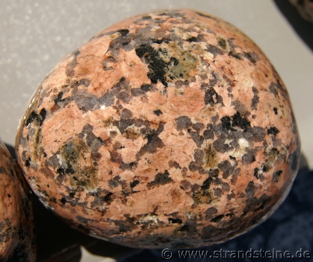 : Große, hautfarbene, teils eckige Feldspäte, reichliche blaugraue Quarzkörner, grünlicher Plagioklas, Biotit in kleinen Putzen