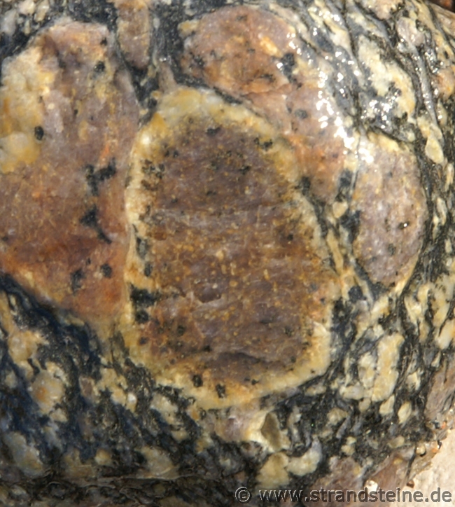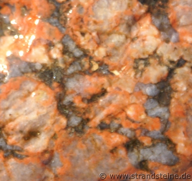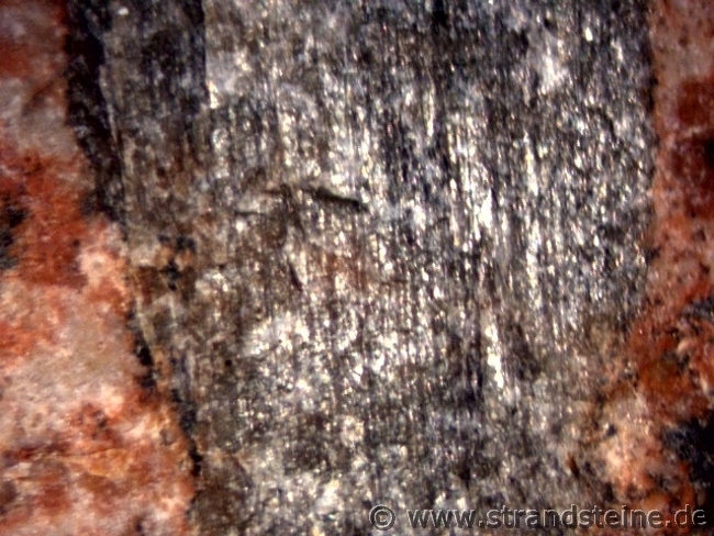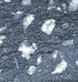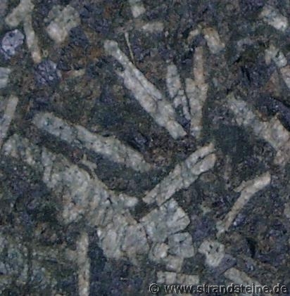 Plagioklaskristalle kann man mit der Lupe in Licht reflektierender Stellung