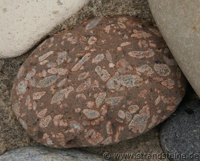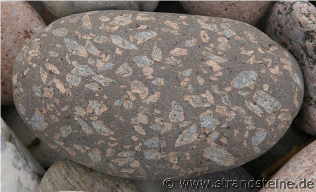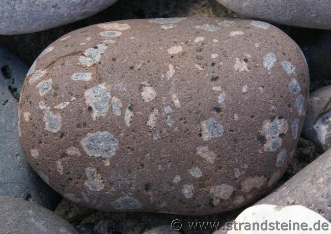 Grundmasse körnig, Einsprenglinge zweifarbig, rosa bis graublau, kleine Aggregate schwarzer Minerale.